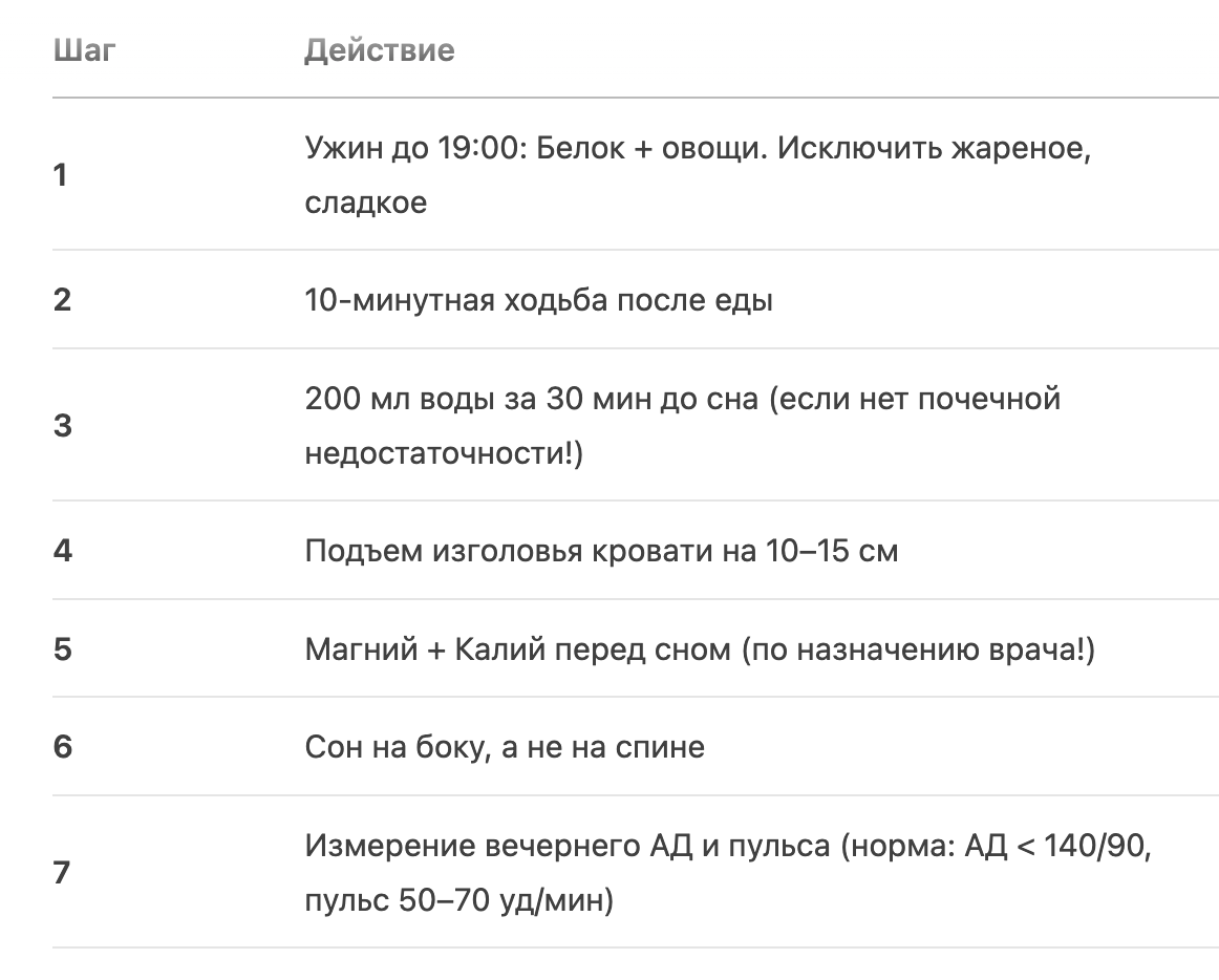 Физиология сна таит скрытые риски для сердца: Замедление пульса на 10–30% во время сна снижает кровоток 8. Сгущение крови из-за обезвоживания усиливает риск тромбоза. Горизонтальное положение тела увеличивает венозный возврат к сердцу, перегружая его. Апноэ сна (остановки дыхания) вызывает кислородное голодание миокарда и аритмии — это выявляют у 80% пациентов с ночными сердечными приступами. Статистика пугает: 40% внезапных смертей после 60 лет происходят во сне. В группе риска — мужчины старше 55 лет и женщины после 60. Смертельная комбинация: 3 привычки, убивающие сердце по ночам Поздний ужин Жирная, углеводная пища перед сном повышает уровень триглицеридов и инсулина, вызывая спазм сосудов. Давление полного желудка на диафрагму затрудняет дыхание и работу сердца. Сидячий вечер Отсутствие легкой активности замедляет метаболизм и ухудшает микроциркуляцию крови. Сон на плоской подушке Низкое положение головы провоцирует заброс желудочного сока (изжога стимулирует вагусный нерв, угнетающий сердечный ритм). Ухудшает дренаж лимфы, способствуя отекам и повышению АД. 7 шагов для защиты сердца: Инструкция от кардиологов На основе клинических рекомендаций и исследований сна: https://avatars.dzeninfra.ru/get-zen...418/scale_1200 НЕ ЯВЛЯЕТСЯ ЛЕКАРСТВОМ Реклама Комплекс Сперотон - настало время стать отцом! Грамотная подготовка к зачатию. Доказанная эффективность. Месяц приема в 1 упаковке. Доказано клинически plan-baby.ru Игорь Ботоговский 203,6 тыс подписчиков Вы подписаны Сердце ночью: Как одна вечерняя ошибка может стоить жизни после 50 Сегодня 320 3 мин Оглавление Почему сердце останавливается именно ночью? Смертельная комбинация: 3 привычки, убивающие сердце по ночам 7 шагов для защиты сердца: Инструкция от кардиологов Показать ещё 63-летний мужчина, не курящий, не пьющий, активный — уснул и не проснулся. Врачи констатировали остановку сердца. Причина? Не "возраст", а ежевечерняя рутина, которую считают безобидной: плотный ужин, диван перед телевизором и сон на плоской подушке. Почему сердце останавливается именно ночью? Физиология сна таит скрытые риски для сердца: Замедление пульса на 10–30% во время сна снижает кровоток 8. Сгущение крови из-за обезвоживания усиливает риск тромбоза. Горизонтальное положение тела увеличивает венозный возврат к сердцу, перегружая его. Апноэ сна (остановки дыхания) вызывает кислородное голодание миокарда и аритмии — это выявляют у 80% пациентов с ночными сердечными приступами. Статистика пугает: 40% внезапных смертей после 60 лет происходят во сне. В группе риска — мужчины старше 55 лет и женщины после 60. Смертельная комбинация: 3 привычки, убивающие сердце по ночам Поздний ужин Жирная, углеводная пища перед сном повышает уровень триглицеридов и инсулина, вызывая спазм сосудов. Давление полного желудка на диафрагму затрудняет дыхание и работу сердца. Сидячий вечер Отсутствие легкой активности замедляет метаболизм и ухудшает микроциркуляцию крови. Сон на плоской подушке Низкое положение головы провоцирует заброс желудочного сока (изжога стимулирует вагусный нерв, угнетающий сердечный ритм). Ухудшает дренаж лимфы, способствуя отекам и повышению АД. 7 шагов для защиты сердца: Инструкция от кардиологов На основе клинических рекомендаций и исследований сна: Тревожные сигналы: Когда менять режим СРОЧНО Проверьте себя. 2 из 5 симптомов — 