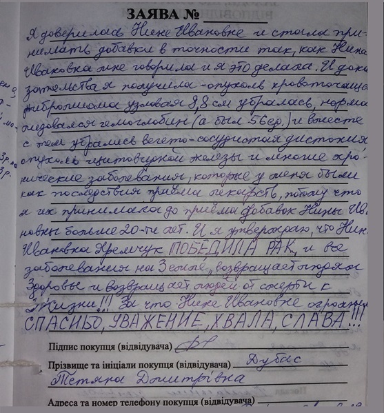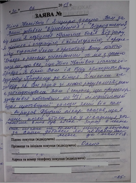 Этот пациент нарушил инструкции по приему добавок ДД «Восстановление» и ДД «Возрождение». И сам себя наказал. Нашей вины в этом нет. По инструкции надо было смазывать опухоль через каждые полчаса. А чтобы не утруждать себя, чтобы сэкономить на добавках, родители приложили ей компресс, а компресс оказывает согревающие действие, и поэтому в инструкции у Нины Ивановны этого нет, в результате чего пошла сильная стимуляция клеток с нарушенной функцией. Какой результат они получили, когда экономили на добавках, а поэтому экономили на деньгах, нарушили инструкцию по приему добавок - они потеряли ребенка по собственной вине. Это есть правда. Вот поэтому родители больше ничего не пишут, не смогли опровергнуть нашу правду. Все, кто четко выполнял инструкции Нины Ивановны, все Ее слова, все имеют положительный результат, в том числе и я моя семья и много других людей вот часть их благодарностей. Вложение 3229 Вложение 3230 Вложение 3231 Вложение 3232Люди смотрите, слушайте и думайте, делайте правильный выбор. Мой вам совет - выполняйте все Нины Ивановны указания, вернете себе здоровье, чтобы радоваться жизни. |
