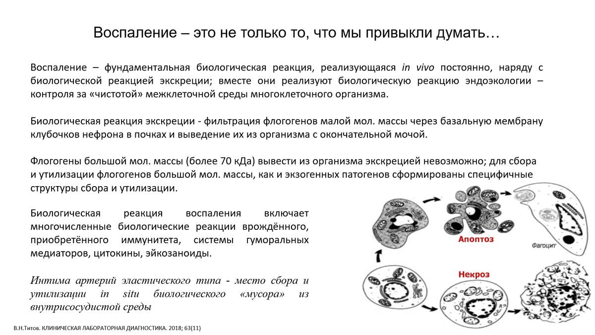 Атеросклероз - это заболевание, в основе которого лежит воспаление. Означает ли это, что лечить надо именно воспаление, а не бороться с изменениями липидного состава крови? Врач-кардиолог, девушка приятной внешности (я был в замешательстве, увидев это - ладно еще, когда врач-реабилитолог что-то такое пишет), имеющая канал на Дзене, недавно опубликовала статью, в которой излагает очень странные взгляды на атеросклероз и его происхождение. Соответственно, и методы лечения отличаются от общепринятых. Дадим слово автору: "Для начала – первичное звено, которое способствует развитию атеросклероза – это воспаление сосудистой стенки, а не высокий холестерин. Высокий холестерин – это следствие. То есть воспаление (повреждение) стенки сосудов организм ремонтирует холестерином – наподобие того, как проводят ямочный ремонт дорог рабочие (немного грубое, но понятное сравнение). Если просто снижать холестерин – организм будет использовать имеющееся количество, потому что ему надо застабилизировать сосуды. До каких пор будут расти ***шки? До тех пор, пока вы не уберете первичное звено атеросклероза и не восстановите целостность сосудистой стенки. Важно знать: на сосудах откладываются не все фракции ЛПНП, а только окисленные. У статинов такой выборочности в снижении нет". Итак, "высокий холестерин - это следствие". В связи с этим мне интересно - а как же атеросклероз у больных с семейной гиперхолестеринемией, у которых (как выяснилось) при наличии генетического дефекта, предопределяющего высокий уровень холестерина в крови, этот холестерин повышен еще внутриутробно? Неужели у плода уже внутриутробно развивается воспаление сосудистой стенки? Семейная гиперхолестеринемия - эта та модель развития атеросклероза, которая помогает нам понять роль холестерина в его развитии. И еще - я крайне удивился, когда узнал, что оказывается холестерин нужен для того, чтобы ремонтировать повреждения сосудов. При этом автор сама себе противоречит: с одной стороны, "на сосудах откладываются не все фракции ЛПНП, а только окисленные", а с другой - печень синтезирует холестерин для того, чтобы его использовать для какого-то "ремонта сосудов", но в нативном, первозданном виде он для этого, получается, не годится - только лишь когда его в виде ЛПНП окислят, тогда он и будет "откладываться" в стенке сосудов. Всё абсолютно не так. Воспаление - это природный механизм, выработанный за миллионы лет эволюции и предназначенный для удаления всего чужеродного (бактерий, отживших своё клеток, чужеродных веществ и т.п., что в целом можно назвать "биологический мусор"). Любой метаболит, который надолго задерживается в крови, становится биологическим мусором и загрязняет внутреннюю среду (это и креатинин, и мочевая кислота, и углекислый газ, и липопротеиновые частицы, и глюкоза и т.д.). https://avatars.dzeninfra.ru/get-zen...0dc/scale_1200 Не все метаболиты удаётся вывести наружу. Если вывести наружу нельзя - остается только один путь: каким-то образом утилизировать в самом организме. Отложить куда-то, где этот мусор не будет сильно мешать. Замести мусор под ковёр. Для крупного биологического мусора, находящегося в кровотоке, найти такое место "под ковром" - это загнать его под внутреннюю оболочку артериальных сосудов и уже там попытаться с ним расправиться с помощью активации воспаления. Активировать воспале