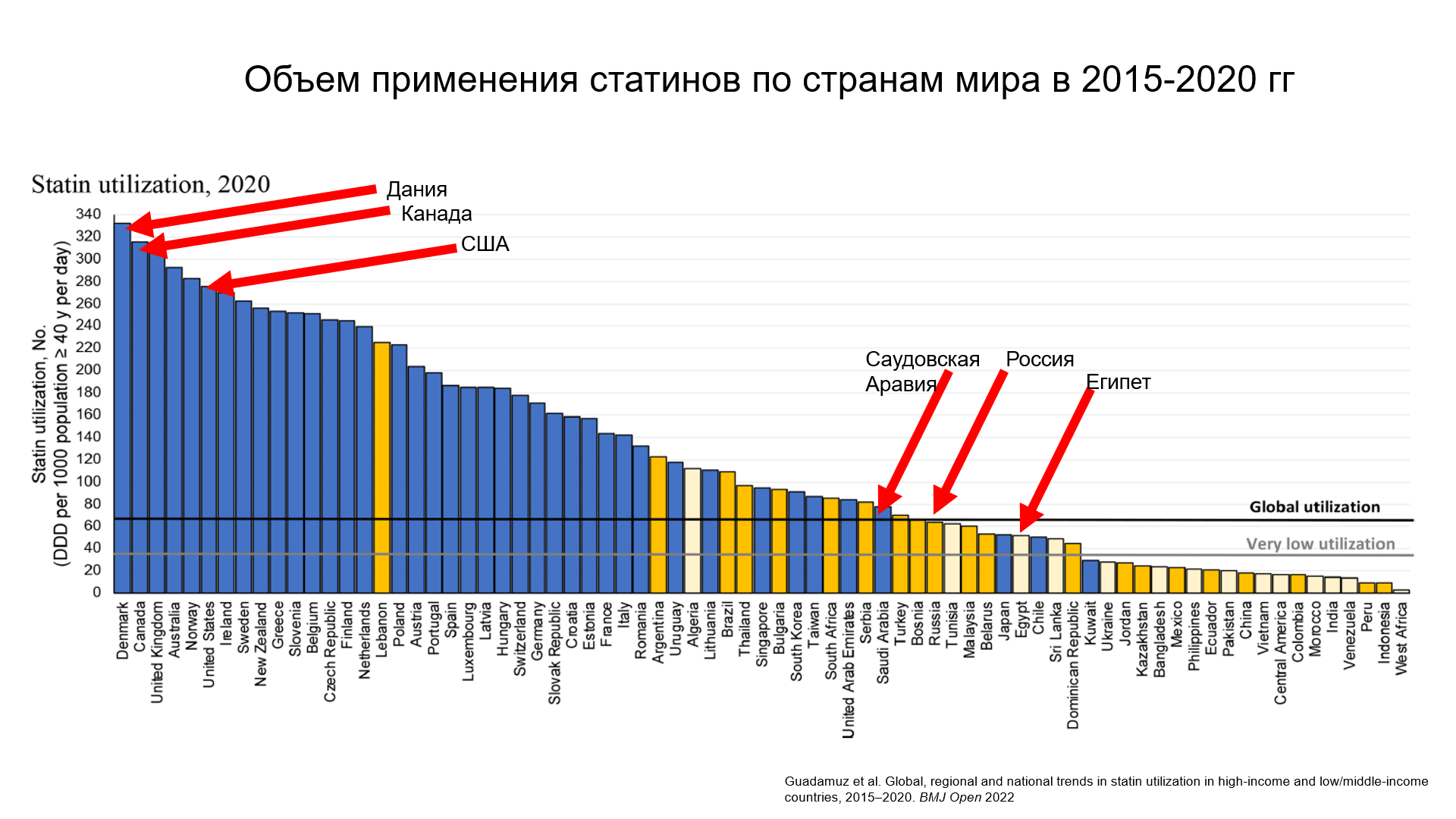 Как показало то же самое исследование ЭССЕ-РФ, в России принимают гиполипидемические препараты (в основном статины) всего-то 1% населения в возрастной группе 35-44 лет и 16% в группе 65-74 лет. Это очень мало. В сравнении с развитыми странами мира. Где потр***ение таких лекарств на 1000 населения в 4-5 раз выше, чем у нас. Доказательства этого привожу ниже: