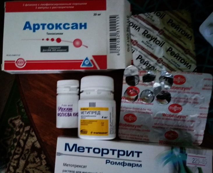Метипред - противовоспалительное, противоаллергическое, иммунодепрессивное действие. Артоксан - нестероидный противовоспалительнй препарат с анальгезирующим и менее выраженным жаропонижающим действием. Рейтоил (рыбий жир и масло проростков пшеницы)- иммуностимулирующее, антигипертензивное, антиатеросклеротическое, противовоспалительное и противопсориатическое действие. Вобэнзим - ферменты с иммуномодулирующим, противовоспалительным, противоотечным, фибринолитическим и вторичноанальгезирующим действием. Фолиевая кислота - стимулятор кроветворения, витамин для усиления иммунной системы. |