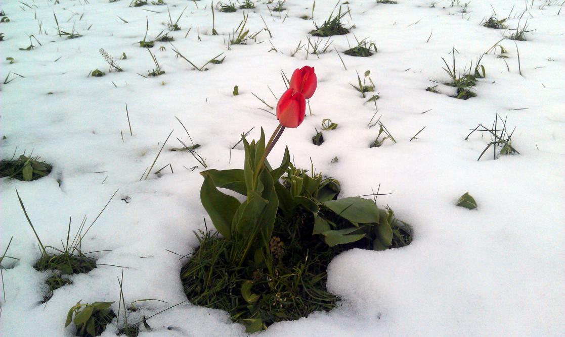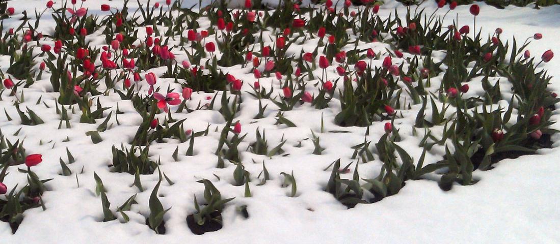 Тюльпаны в снегу в апреле. Было резкое похолодание. Температура упала с 20 до 0 градусов.