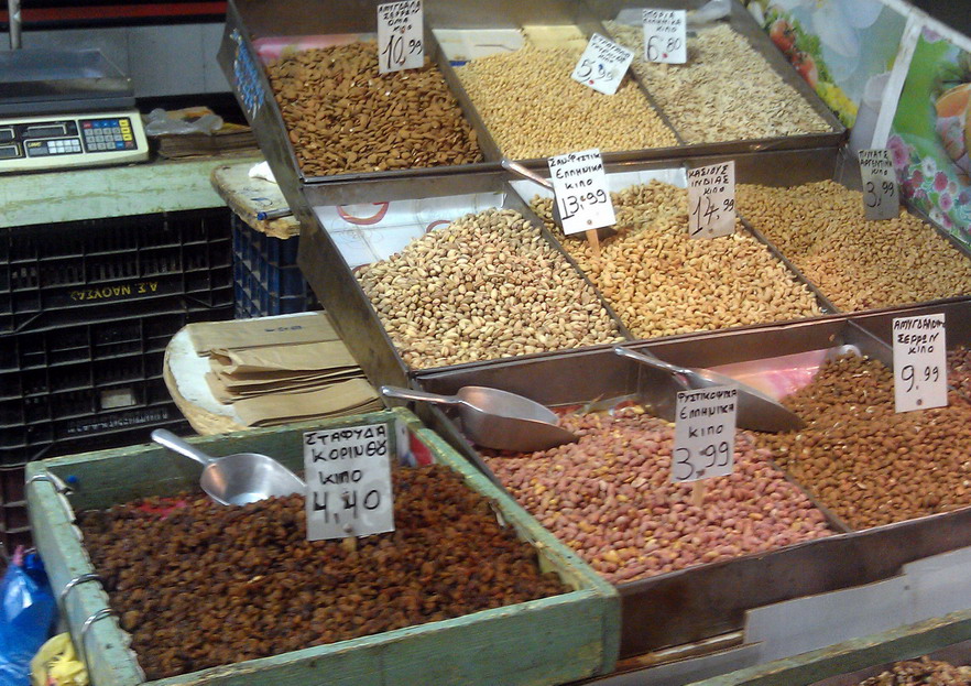 Фисташки и орешки в Греции на местном рынке. Цены в 3-10 евро.