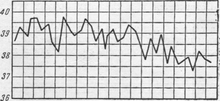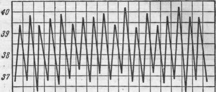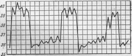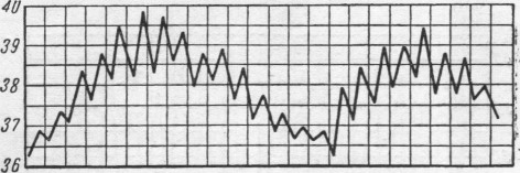 Характеризуется внезапным подъемом температуры до высоких цифр и падением ее лишь через несколько дней до нормы с сохранением нормальной температуры в течение ряда дней и наступлением нового периода лихорадки с последующим падениём. Таких приступов возвратной лихорадки бывает от 2 до 5; она характерна для возвратно] о тифа (рис. 8). Вложение 4824 Рис. 8. Возвратная лихорадка. |