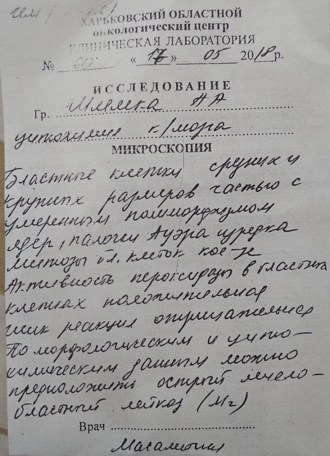 Здравствуйте ув. форумчане!!! Прошу о помощи. У моего мужа Шльомки Андрея острый миелобластный лейкоз (М2). О Болезни узнали чисто случайно, все знакомые начали говорить, что у тебя муж какой-то желтый. Пошли на узи, печень и селезенка увеличена, сдали кровь, от показателей в шоке. Девять тромбоцитов (при минимум 180), бласты в крови. Сделали пункцию костного мозга, диагноз подтвердился.