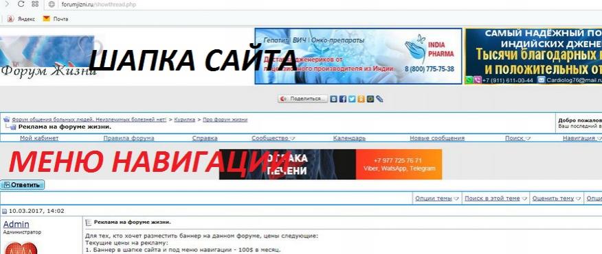 Шапка сайта (100$ в месяц) и меню навигации (100$ в месяц). 1.Баннер в шапке - размер 475 на 130 пикселей. 1.1. Баннер в меню навигации - размер 900 на 70. 2. После первого сообщения.