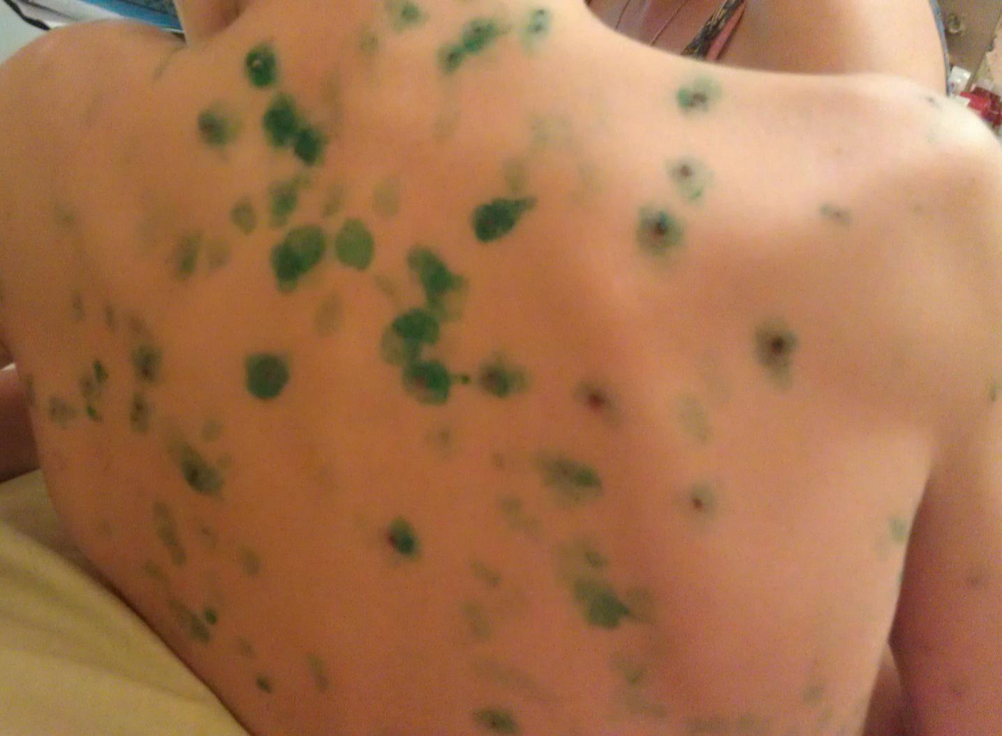 Зеленка, кроме того, что маркирует высыпания, еще и снимает зуд и защита от инфекций.