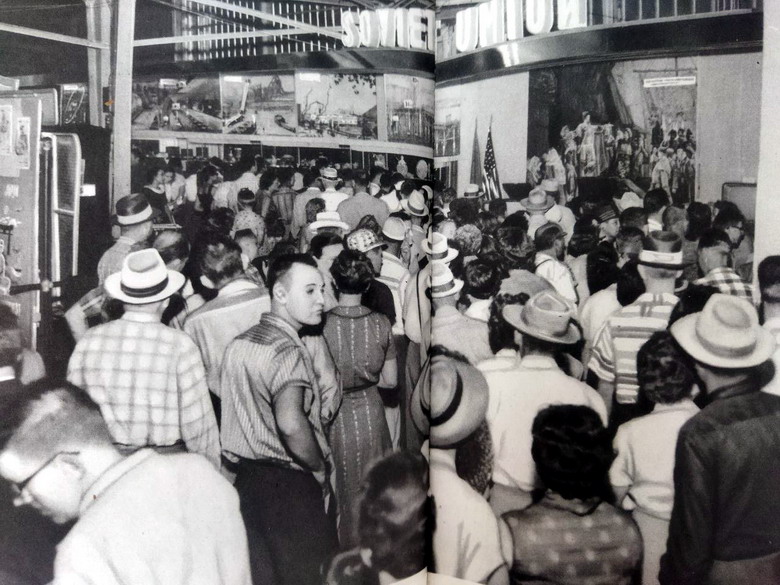 С каждым годом растет интерес простых людей Америки к нашей стране, к нашему народу. Советский павильон на выставке в Оклахоме (1957 год) ежедневно посещали в среднем 60 тысяч американцев. |