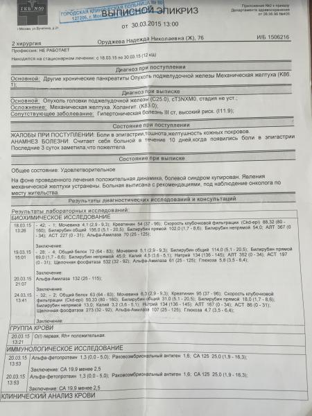 У меня заболела бабушка. Вся сложность в том, что она не хочет проводить дальнейшую диагностику и я не знаю как ей помочь. Она госпитализировалась 2 раза за последние 3 месяца. Ей 76 лет. Первый раз, 17 февраля, диагноз - хронический панкреатит, острой стадии. Все анализы хорошие, рак не обнаружен. Второй раз, 30 марта, ее выписали с диагнозом рак головки поджелудочной железы Т3NxM0, стадия не установлена. Плюс к этому Гипетроническая болезнь III ст., высокий риск. Про этот диагноз она не знает (я решила ей не говорить и теперь не знаю правильно это или нет. У нее совсем недавно умерла подруга от этой заразы и она была под таким впечатлением! Сейчас она только и твердит, что не хочет быть мне обузой и поскорее бы выздороветь, а если ей сказать, то она совсем упадет духом) Она очень слабая, плохо ест, аппетита нет. Постоянные боли, особенно после еды. Обезболивающие не помогают, последнее время пила баралгин, но он тоже уже не действует. Какую-либо операцию делать отказывается наотрез. В больнице ей сделали протезирование желчный протоков пластиковым стентом. После этого желтуха прошла, но она почти перестала ходить. Я не знаю чем ей помочь, т.к. она отказывается от всех дополнительных исследований. В больнице, до момента выписки, врачи говорили, что все хорошо и маркеры на онкологию брали - ничего не находили. Я думаю, можно ли мне одной с бабушкиной выпиской обратиться к онкологу? В поликлинике меня одну вряд-ли примут без нее, поэтому может посоветуете куда бы я могла обратиться? Платные консультации? Буду очень благодарна за любые советы! |
