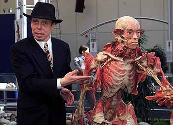 Гюнтер фон Хагенс является изобретателем метода пластинации. В процессе пластинации растворимый жир и все телесные жидкости заменяются реактивными пластмассами, полимерами и резинами. Эти вещества обладают качествами естественных телесных жидкостей, при этом они не подвергаются процессу разложения. Гюнтер фон Хагенс (Gunther von Hagens) является профессором анатомии, а также основателем и директором Хайдельбергского института пластинации (Institute for Plastination, Heidelberg). Пластинацией называется совокупность методов, применяемых для сохранения биологических тканей и анатомической структуры мертвых тел, частей тела и органов. "Впервые о фон Хагенсе заговорили в 2000 году, когда он организовал в Германии выставку, ключевая композиция которой носила название Конь и всадник. Фигура всадника тогда еще была изготовлена из пластика, а при создании коня использовались мумифицированные останки настоящей лошади. Со временем фон Хагенс и его коллеги значительно усовершенствовали свою технику. На новой выставке Миры тела & зеркало времени все экспонаты созданы из останков настоящих людей и животных. С того момента, как фон Хагенс представил вниманию общественности своих первых пластинатов, его выставки по всему миру посетило более 26 миллионов человек. Выставка начинается с демонстрации человеческого зародыша, превращающегося в плод. В стеклянных колбах представлен понедельный рост плода. У микроскопической девочки уже в 7 недель видно по пять пальцев на обеих руках. Далее представлены тело с развитой мускулатурой атлета; тело "шахматиста"; тело курильщика и человек, держащий на руке собственную кожу. Отдельный зал посвящен кровеносной системе. Впечатляет рука с полностью сохраненной кровеносной системой: рука кажется ярко-красной из-за микроскопических кровеносных сосудов.(с) Баянище, конечно. Просто интересно - кто свое тело бы отдал на растерзание?