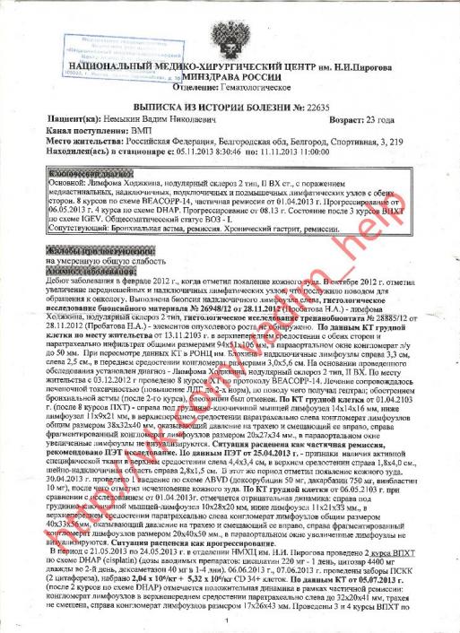 Диагноз: Лимфома Ходжкина, нодулярный склероз 2 тип, IIBX ст., с поражением медиастинальных, надключичных, подключичных и подмышечных л\у с обеих сторон. Вадим прошел 8 курсов стандартной химиотерапии, затем еще 7 курсов высокодозной ХТ. За год с лишним ни разу не была достигнута ремиссия, болезнь продолжает прогрессировать; врачи признали в нашем случае аутотрансплантацию стволовых клеток неэффективной. __________________________________________________ __________________________ В данный момент Вадиму требуется лечение дорогостоящим противоопухолевым препаратом ADCETRIS (BRENTUXIMAB VEDOTIN), покупка которого возможна только за границей. Без данного препарата наши доктора оценивают шансы на выздоровление Вадима как очень маленькие. Одна ампула данного препарата стоит 3.300 евро. Для проведения 1 курса химии требуется 3 ампулы. Всего таких курсов нужно около 16. Все наши запасы исчерпаны. Квартира выставлена на продажу, на семье висит крупный кредит. Также мы дали заявки в фонды помощи, обращались в администрацию нашего города, однако они не могут покрыть даже половины всей суммы, требующейся для лечения, а нужно около 8 млн рублей. __________________________________________________ __________________________ У семьи Вадима осталась одна последняя надежда - на простых людей; их участие, понимание, добрые сердца. Обращаемся ко всем добрым людям: не оставьте нас в этой беде. Помогите кто чем может, вместе мы сможем помочь выиграть Вадику эту тяжелейшую борьбу за право на драгоценную жизнь. Web money - R132355504665 Яндекс деньги - 410012056492919 Последний раз редактировалось Альбинa; 05.12.2013 в 19:29.. |