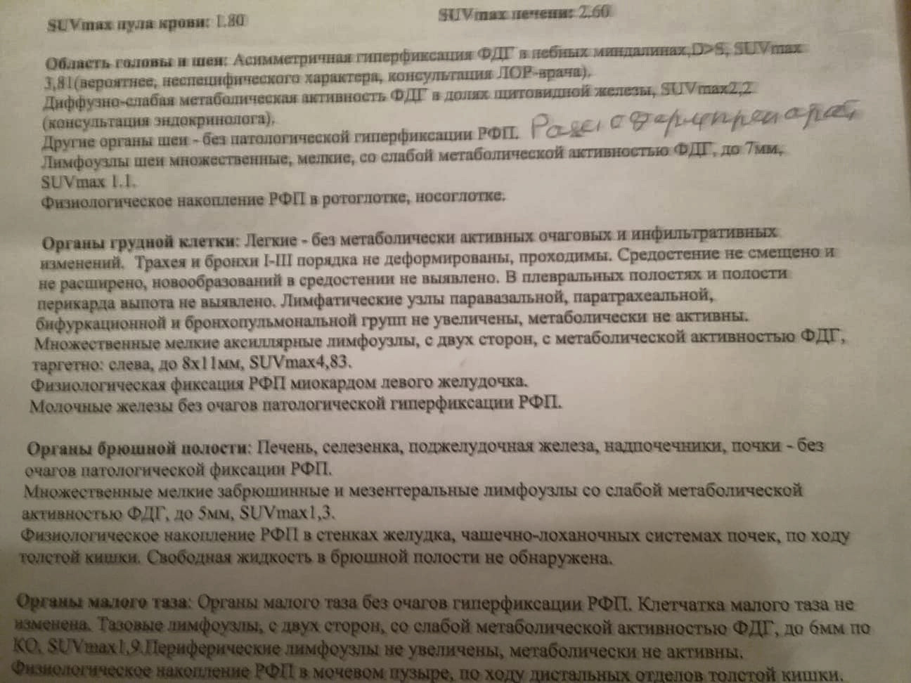 Здравствуйте уважаемые врачи, форумчане, специалисты. Подскажите пожалуйста, теща прошла ПЭТ КТ(фото заключения приложил), во время которого выявлена Лимфаденопатия в 5 зонах, если я правильно все понял (не врач/специалист). Может ли такая обширная патология быть предвестником рака? И если так понимаю что этого диагноза вероятно не достаточно для полноты картины, то о чем может вообще говорить такой диагноз, и каким еще обследованием порекомендуете дополнить и выложить здесь для хоть какой-то полноты картины? Спасибо заранее!