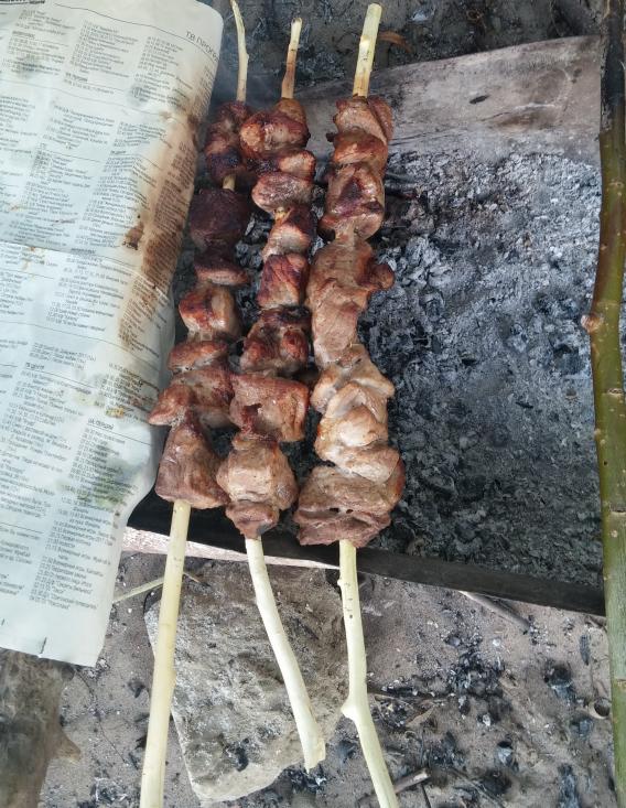 Спонтанно захотелось шашлыков, купили маринованное мясо в супермаркете, а шампуров не было. Сделали шашлык на ветках деревьев.