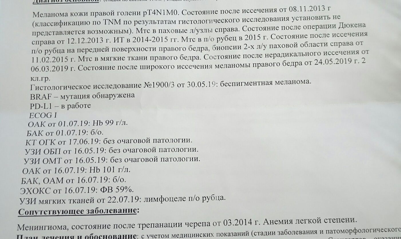 Операция по удалению группы лу сложная, и до сих пор неизвестно,нужно ли вам это. Вам нужно выйти на центры,которые делают БСЛУ (до широкого удаления меланомы,после достаточно сложно искать сторожеаой-хотя у меня вот вышло после широкого)- это Питер,Москва,лучше всего Обнинск.Все это делается быстро и без оформления бумаг типа квот и направлений (кроме сбора обычных анализов для операции). Исследуют сторожевой и определят необходимость полной лимфодиссекции. Так же необходима ПЭТ-КТ. Вам должны дать направление в ближайший центр(иногда это очень трудно). После БСЛУ и ПЭТ определяется стадия. И далее все зависит от нее- просто наблюдение или лечение иммунотерапией (опдиво ,кейтруда) или таргетами. При подтверждении меланомы так же следует сдать блоки на определение Браф -мутации (это нужно для определения тактики лечения, у браф-мутированных есть еще таргеты для лечения). Сейчас меланома уже не приговор, как это было 5-10 лет назад. Я общаюсь с людьми в ремиссии по 10 лет и после первой, и после третьей, и после четвертой стадии. Вы знакомы с группой Меланомы.нет в ВК? Там вы найдете адекватную информацию по лечению,врачам и центрам.Здесь же бардак совсем стал. |