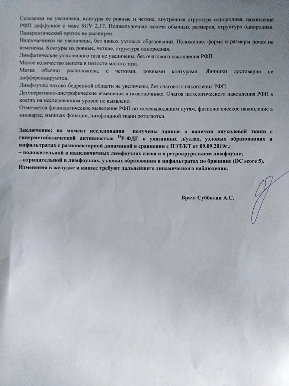 Меня просто смущает, что по КТ и Пэт разные результаты. Мне кажется ни одна из химий не сработала на лимфоузлы брыжейки. Будто их не замечают врачи и назначают просто потому что так нужно по протоколу |