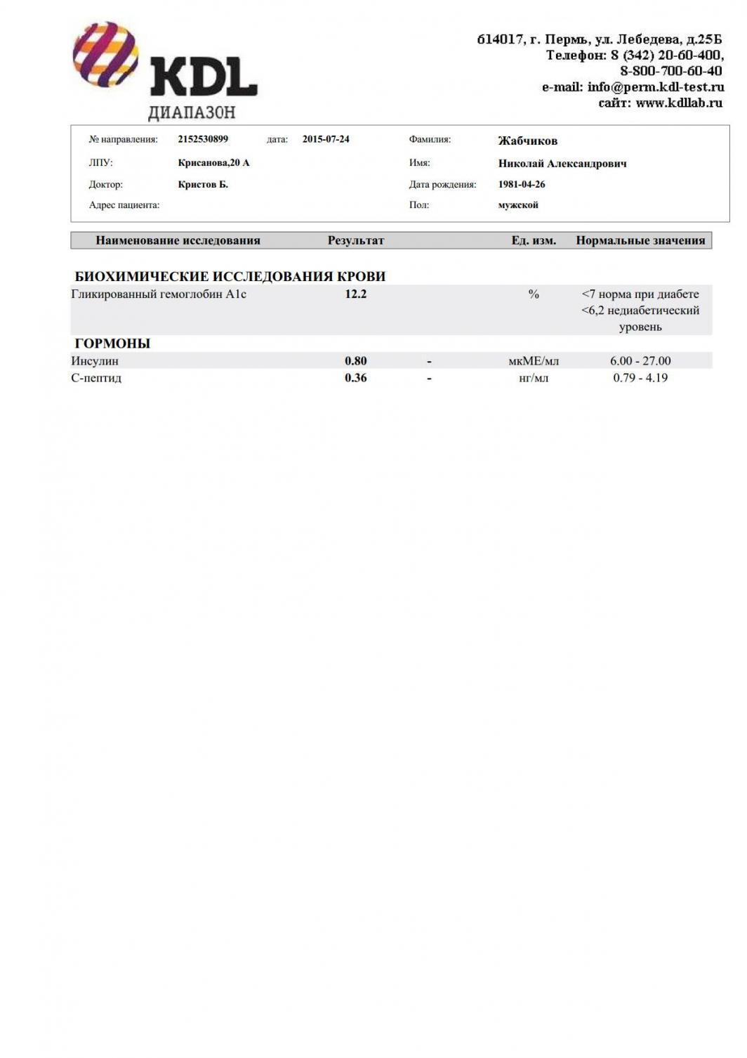 Скоро буду делать очередные лабораторные анализы для подтверждения работы методики лечения диабета 1 типа. Анализы на: С-пептид Инсулин Фруктозамин Гликированный гемоглабин Всем, кто печется о своем здоровье, и хочет вылечить наконец свой заслуженный диабет, оставляйте данные мне на почте vopros@designforevent.ru (vk.com/zhabchikovn) В сообщении письма пишите "Я хочу вылечиться от диабета СД1 и СД2", в зависимости от того, какой у Вас недуг. Ребята, СД1 ИЗлечим! Да, не быстро (лично я лечусь с 13 февраля 2015г.), да, не просто! Жесткий самоконтроль и дисциплина, но ЭТО РЕАЛЬНО!!! Уже совсем скоро я выложу в интернет результаты, которые покажут картину, с чего я начинал (Убийственный диагноз и сахара под 25 ммоль/л на тощак) и к чему пришел в настоящем - Сахар на тощак в среднем 6,3 ммоль/л. Не за горами полное выздоровление. На фото во вложении можно видеть, как я выглядел на третий день после 7-ми дневного голодания. Уколы инсулина я прекратил делать за день до начала этого процесса. На животе еще видны не зажившие следы инъекций (области отмечены красными квадратами). Сегодня (11.10.2015г.) 4-й день, как закончилась голодовка. Инсулин не колю. Картину, как ведет себя сахар, я представил в посте. Уточню, что мой стандартный вес до начала заболевания (явные признаки, конец 2013г.) - 67 кг. На фото 60,02 кг при моем росте 182 см. |