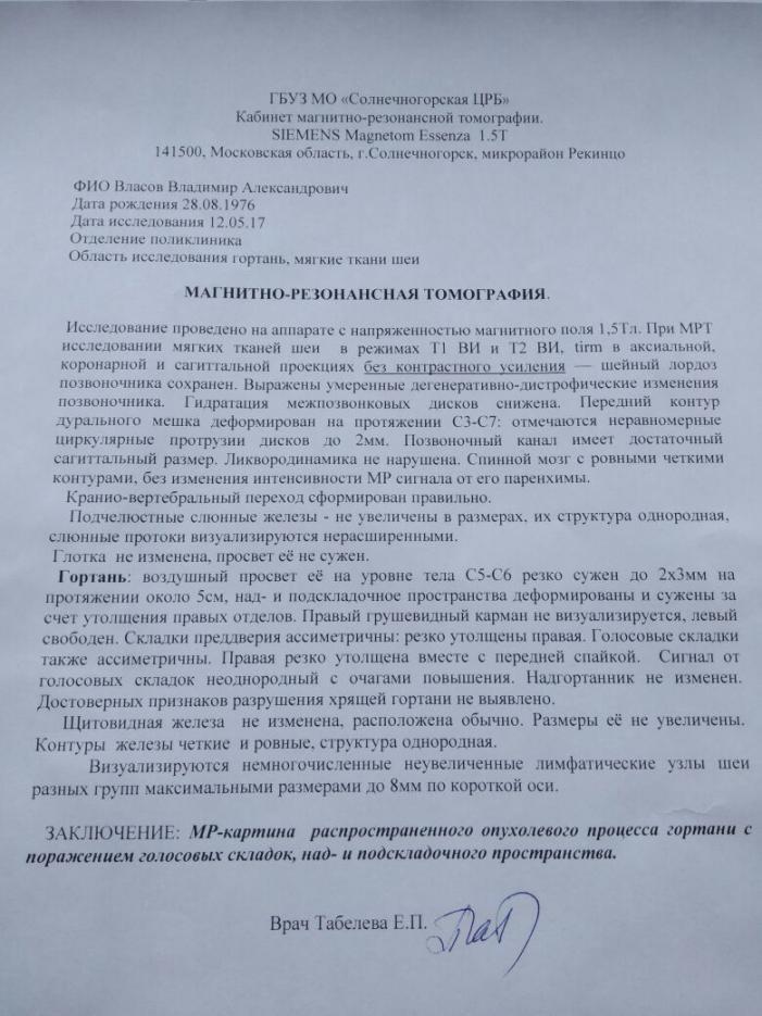 katerina1984 Доброе утро!как к вам обращаться?у меня была примерно такая же история(((охриплость-осиплость-афония-одышка(до 4 этажа с ребенком на руках еле еле поднималась) сделали трахеостому,что б не задохнуться,биопсии 2 шт! Потом лучевая и операция. Не хочу вас пугать,но меня кроме проблем с голосом ни чего не беспокоило и анализы отличные были.