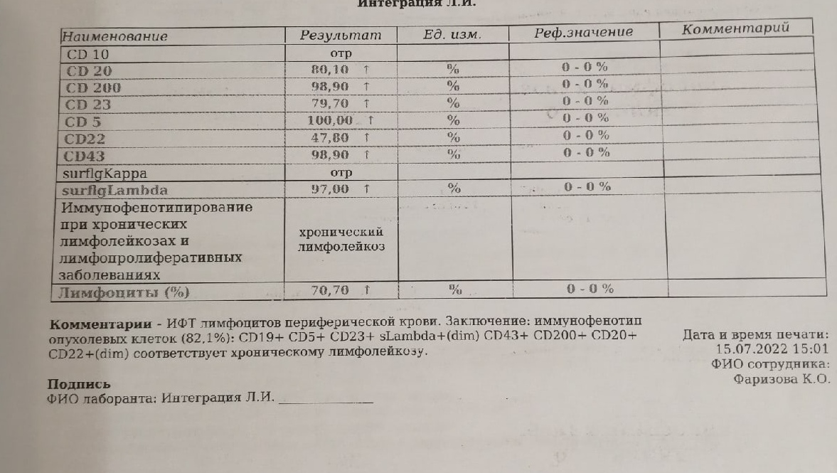 3дравствуйте,Евгения, прочитала весь форум, так поняла,что вы неплохо изучили данный вопрос,прошу вашего совета,а также всех уважаемых форумчан,кто разбирается в этом - папе поставили стадию A ХЛЛ по результатам иммунофенотипирования и прощупывания селезенки и лимфоузлов подчелюстных,подмышечных и в паху - ничего не увеличено. Низкий гемоглобин,но у папы хр.геморрой,а также простатит и проблемы с клапанами сердца (56 лет). Результаты анализов прикладываю. Биохимия вся в норме. Первый гематолог ,кто поставил стадию А,отправил на УЗИ, второй гематолог,к которому мы обратились по онлаин-консультации, сказал,что нужно КТ или МРТ с контрастом грудной,брюшной полости и органов малого таза, а также сделать пробу Кумбса,ЛДГ, и щелочную фосфатазу, потому что он ставит под сомнение стадию А. Мы же боимся облучать папу лишний раз,подскажите, возможно сделать просто то же УЗИ или МРТ без контраста, разве увеличенные лимфоузлы или органы не будет видно при обычном исследовании. Живем теперь всей семьей как на пороховой бочке, боимся и что-то сделать и что-то не сделать, очень страшно,помогите,пожалуиста,советом. Гематолога в нашем маленьком городе нет, записались к платному в областной,но прием там через месяц только.