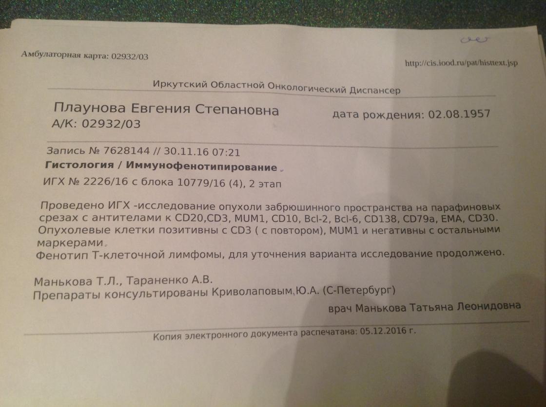 Добрый вечер Анатолий и форумчане! Вот , что сегодня врач выдал, но сказал, что анализ опять еще не окончательный, его будут доделывать, и по биопсии КМ ориентироваться, так что может завтра вошьют порт, его сосудистый хирург вшивать будет, и биопсию и может домой отправят в четверг, до следующей недели, ждать точный диагноз. Сначала с химией торопили, а сей час пока откладывают, но надеюсь так нужно....
